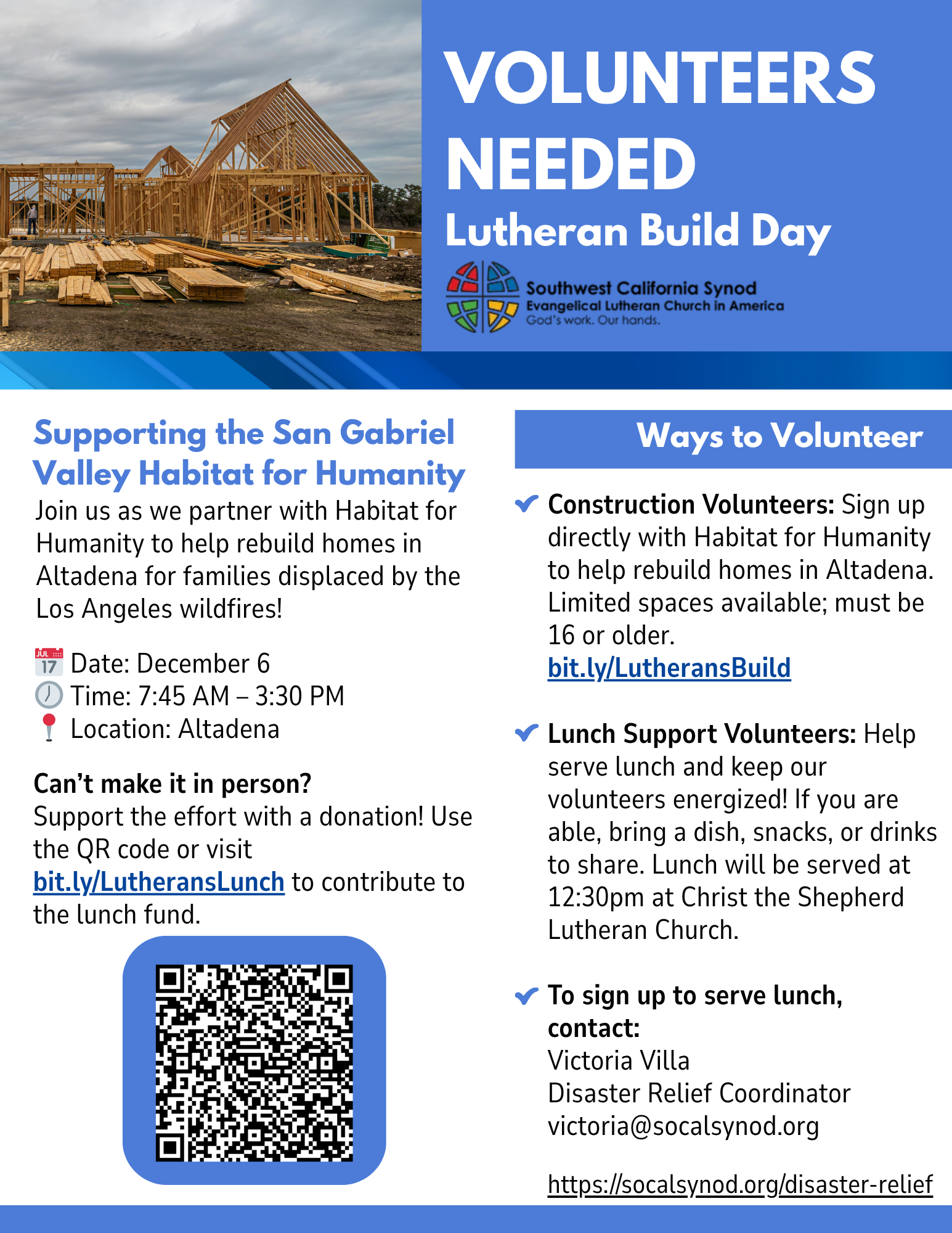 Disasters can happen unexpectedly and often leave lasting challenges for individuals, congregations, and communities. In response to the devastating Los Angeles wildfires and their widespread impact, the Southwest California Synod established the Disaster Relief Coordinator role to help congregations be better prepared, respond with care, and accompany communities through recovery. This role was made possible through the generous support of Lutheran Disaster Response.