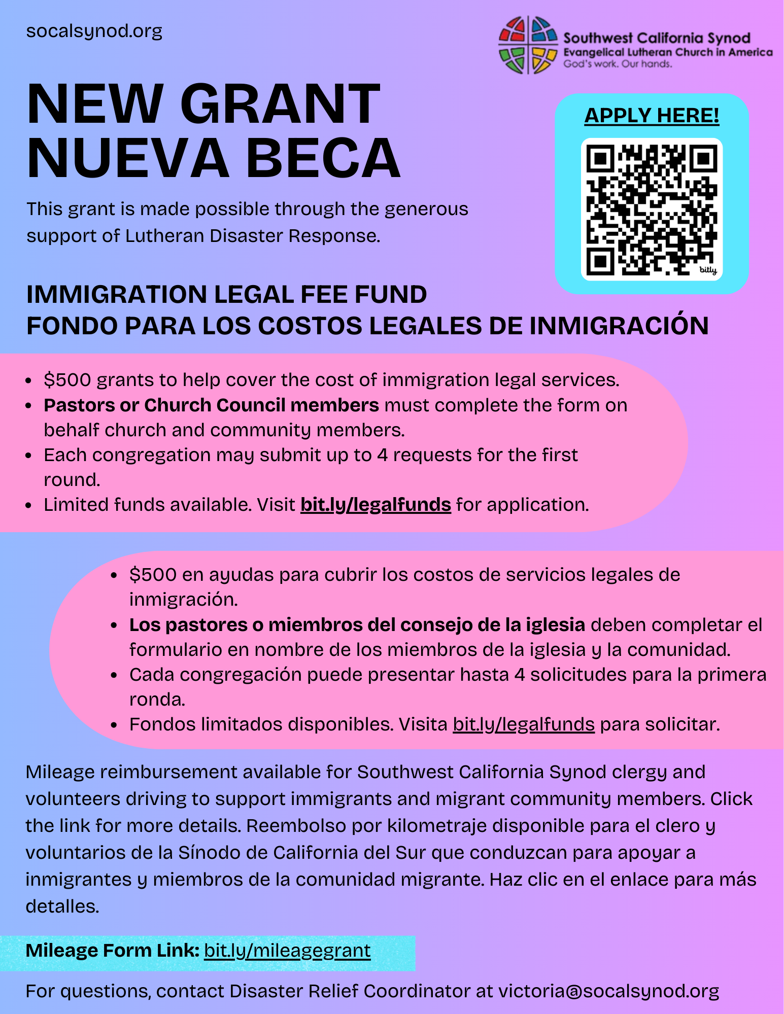 The Southwest California Synod is offering a Los Angeles Fire Recovery Grant to support ELCA congregations, partner ministries, and individuals who were impacted by recent wildfires. Any ELCA Congregational Council officer or pastor may submit an application. Eligible applicants can use the button below to begin the application process. For questions, our Disaster Relief Coordinator’s contact information can be found here.