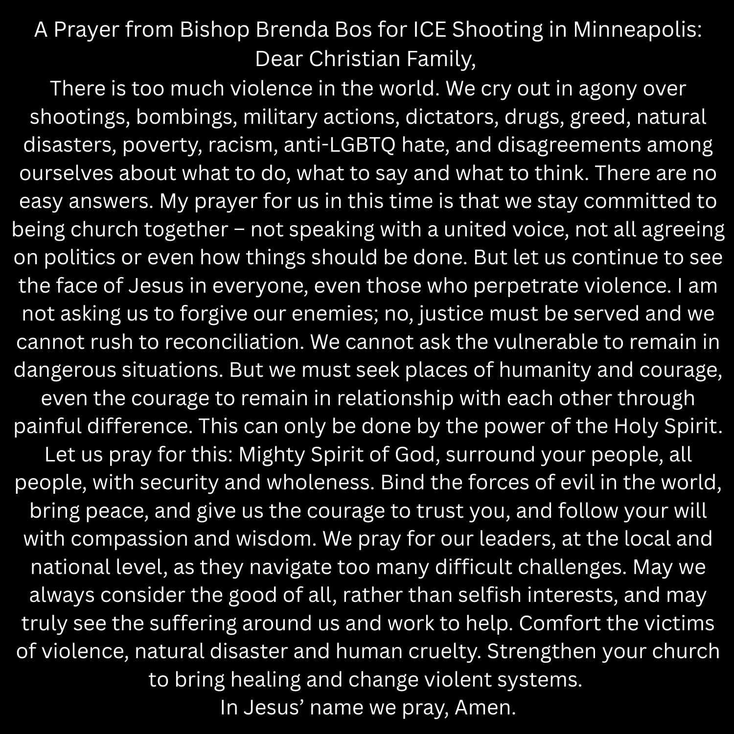 A Prayer from Bishop Brenda Bos, January 8, 2026: Dear Christian family, There is too much violence in the world. We cry out in agony over shootings, bombings, military actions, dictators, drugs, greed, natural disasters, poverty, racism, anti-LGBTQ hate, and disagreements among ourselves about what to do, what to say and what to think. There are no easy answers. My prayer for us in this time is that we stay committed to being church together – not speaking with a united voice, not all agreeing on politics or even how things should be done. But let us continue to see the face of Jesus in everyone, even those who perpetrate violence. I am not asking us to forgive our enemies; no, justice must be served and we cannot rush to reconciliation. We cannot ask the vulnerable to remain in dangerous situations. But we must seek places of humanity and courage, even the courage to remain in relationship with each other through painful difference. This can only be done by the power of the Holy Spirit. Let us pray for this: Mighty Spirit of God, surround your people, all people, with security and wholeness. Bind the forces of evil in the world, bring peace, and give us the courage to trust you, and follow your will with compassion and wisdom. We pray for our leaders, at the local and national level, as they navigate too many difficult challenges. May we always consider the good of all, rather than selfish interests, and may truly see the suffering around us and work to help. Comfort the victims of violence, natural disaster and human cruelty. Strengthen your church to bring healing and change violent systems. In Jesus’ name we pray, Amen.