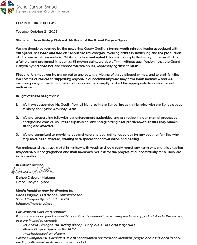 Bishop Hutterer of Grand Canyon Synod has released a public statement available at www.gcsynod.org/news.